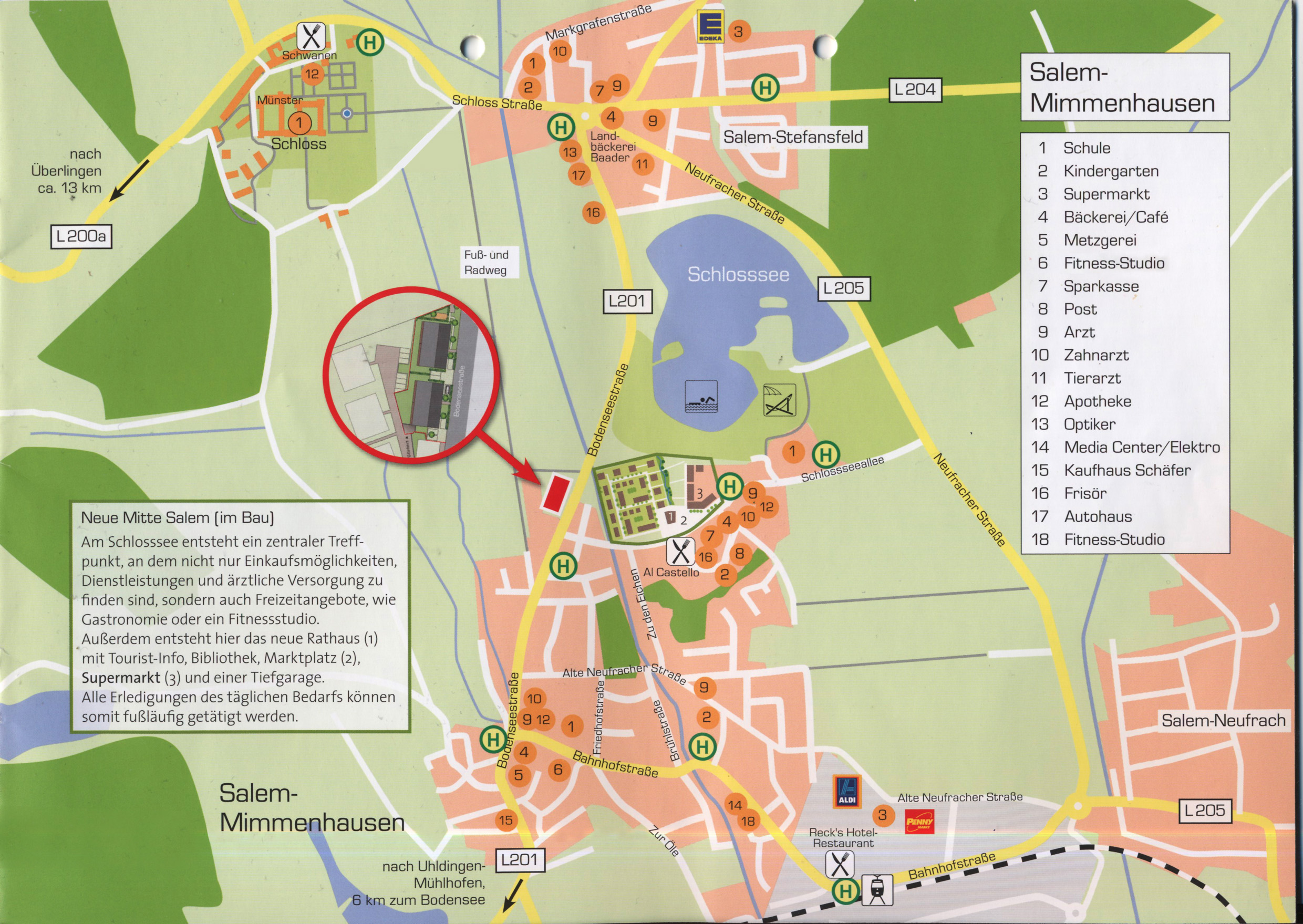 Salem ist ein staatlich anerkannter Erholungsort. Eingebettet in eine der schönsten Kulturlandschaften Europas, nur einen Steinwurf vom Bodensee entfernt. Sie erleben eine perfekte Symbiose aus Tradition, Natur und moderner Lebensart. Die Gemeinde Salem ist ein dynamischer Wirtschaftsstandort, sowie gleichermaßen ein Wohlfühlort für Familien, Berufstätige, Senioren und Ruheständler. Die neue Mitte Salem ist ein modernes Zentrum, mit allem was Sie zum täglichen Leben benötigen. Sie sind sowohl mit gesunden Lebensmitteln vom Wochenmarkt, als auch mit einem Ärztezentrum, einer Bücherei und einem Edeka rundum versorgt. Entspannen Sie sich inmitten des neuen Zentrums, im verkehrsberuhigten Bereich.